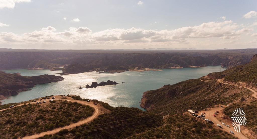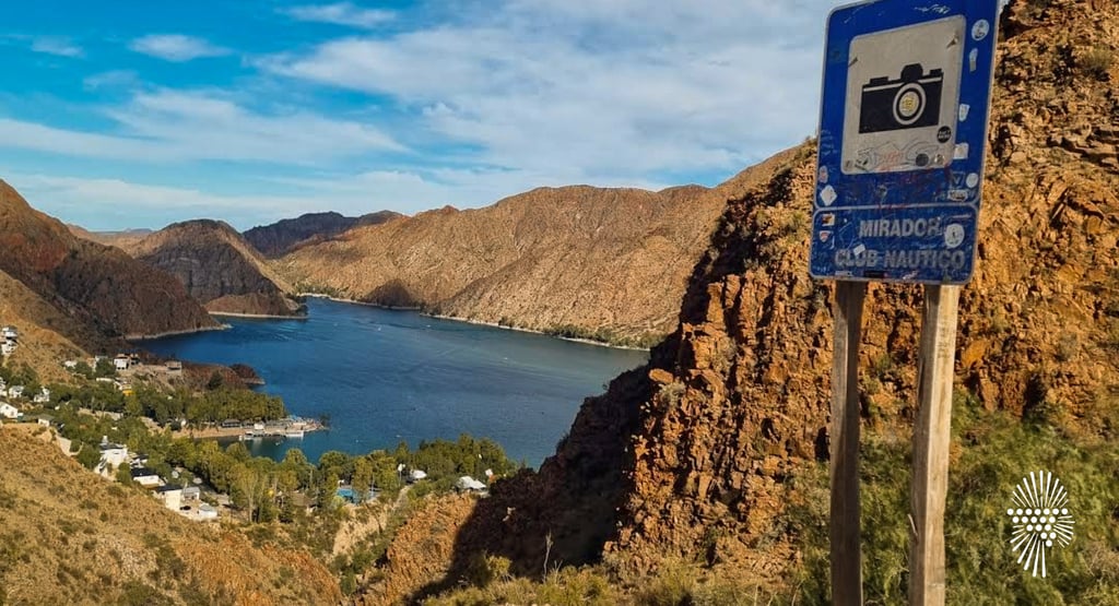Ubicado antes de la bajada hacia el embalse por camino de ripio, este mirador te regala una de las vistas más lindas de Los Reyunos. Desde arriba podés ver el lago rodeado de montañas rojizas y pequeñas construcciones que parecen miniaturas. Es ideal para parar, sacar fotos y dimensionar la inmensidad del lugar antes de descender.
