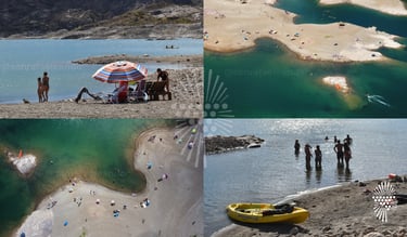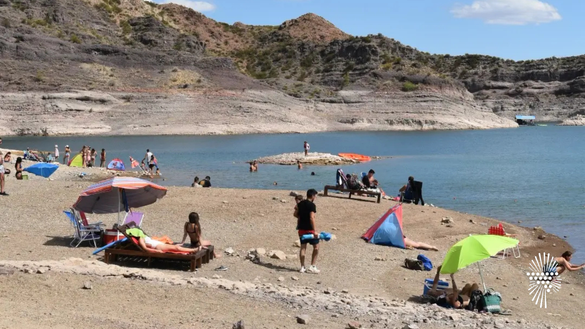 Lo primero que vas a sentir es la inmensidad del silencio. El lago se abre entre las montañas como un remanso de paz, con aguas frías y transparentes, perfectas para refrescarse en los días calurosos del verano mendocino. El balneario es de piedras redondeadas, lo que le da ese toque rústico y natural, sin arena pero cómodo para instalarse con una lona, una reposera o simplemente dejarse caer sobre una toalla al sol.