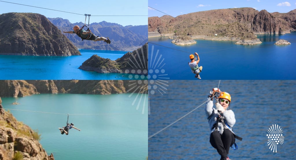 Una de las tirolesas más largas de Argentina está en Los Reyunos. Y no es cualquier tirolesa: el tirobangi es una modalidad que te permite volar como superhéroe, con el cuerpo extendido, las manos libres y el viento de frente. El recorrido es de dos cables de 500 metros cada uno, con un trekking guiado entre los cerros y un cruce aéreo sobre el embalse que corta la respiración. Una experiencia imperdible para quienes buscan aventura con seguridad y vistas inolvidables.