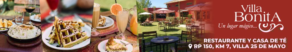📍 Villa Bonita: un espacio con aire de campo, tranquilo y familiar, donde podés disfrutar de platos tradicionales como carnes asadas, pastas y empanadas caseras. El ambiente natural y el servicio cálido lo convierten en una excelente opción para almorzar.
